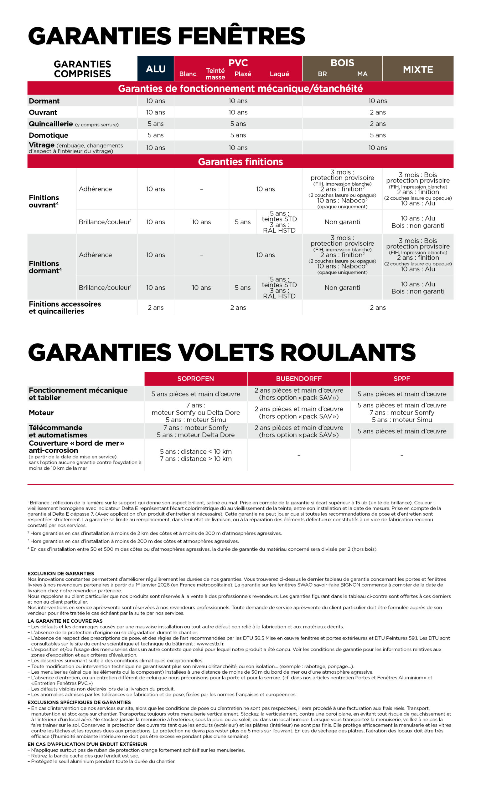 Nos innovations constantes permettent d’améliorer régulièrement les durées de nos garanties. Vous trouverez ci-dessous le dernier tableau de garantie concernant nos menuiseries livrées à nos revendeurs partenaires à partir du 1er janvier 2025. La garantie sur les menuiseries BIGNON commence à compter de la date de livraison chez notre revendeur partenaire. Le remplacement ou la réparation ne modifiera par le régime de garantie et n’en prolongera pas sa durée.